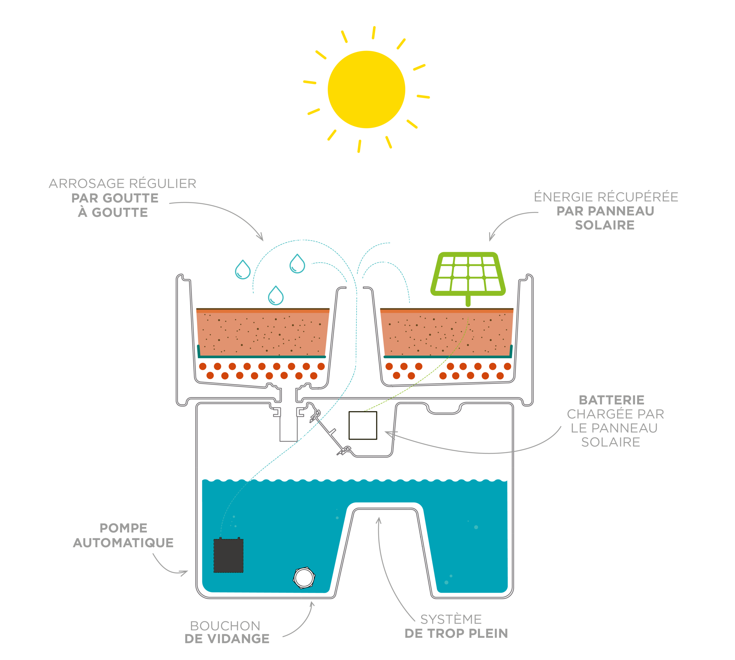 Notre système d’arrosage par goutte à goutte, piloté par énergie solaire vous assurera un arrosage régulier dans la journée, et les réserves d’eau, placées sous le bac de plantations (200 litres) qui récupèrent en permanence les eaux de pluie et d’arrosage vous permettront de tenir de 5 à 8 semaines sans une goutte de pluie (selon le secteur géographique et ses conditions climatiques)